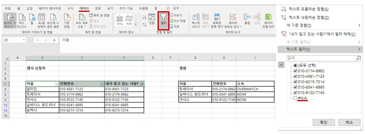 메뉴 - 데이터 - 필터를 걸어 #N/A를 제외하면 내가 알고 있는 사람들의 목록을 볼 수 있다.