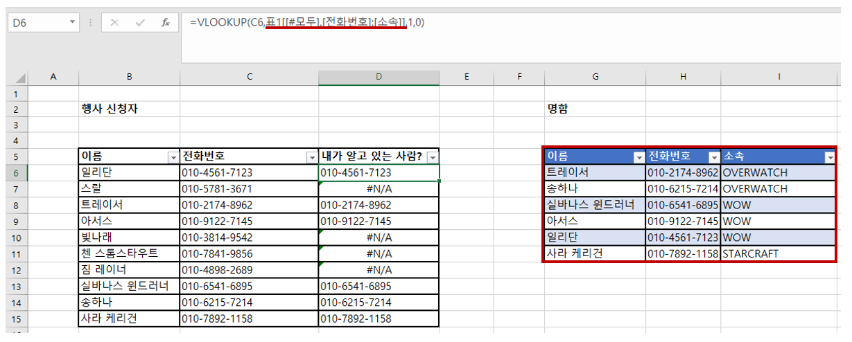이미 VLOOKUP이 완료되었는데 명함을 한 장 더 받아서 새로 추가된다면 제대로 반영되지 않는다.