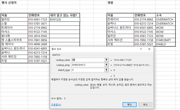 MATCH 함수는 해당 값이 몇 번째에 존재하는지 위치를 알 수 있는 함수이다.